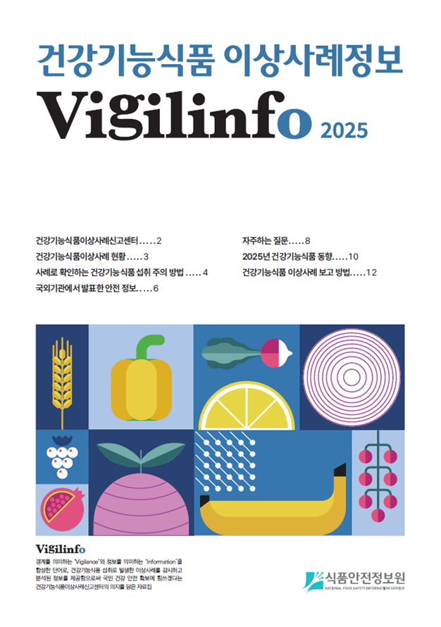건강기능식품 이상사례정보 Vigilinfo는 건강기능식품 섭취로 발생한 이상사례를 감시하고 분석한 정보를 제공함으로써 국민 건강 안전 확보와 관련 산업 발전을 견인하겠다는 식품안전정보원의 의지를 담고 있는 자료집으로 2023년부터 매년 발간하고 있다.
