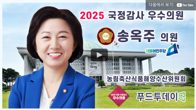 송 의원은 “앞으로도 국민 먹거리 안전과 건강한 식탁을 지키고, 농축산어업인과 농어촌 공동체의 권익을 두텁게 보호하기 위한 정책 마련에 최선을 다할 것"이라며 "나아가 이번 국정감사에서 제기한 사안들에 대해 단순 지적이 끝이 아닌, 제도개선·법안마련 등 실질적 후속 조치의 지속적 이행을 통해 현장에서 체감할 수 있는 변화로 연결시키겠다"고 말했다.