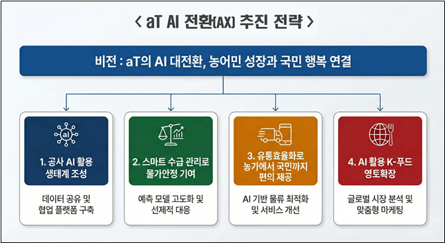 이번 AI 전환 추진 4대 전략은 aT AI 활용 생태계 조성, 스마트 수급관리로 물가안정 기여, 유통효율화로 농가에서 국민까지 편의 제공, AI활용 K-FOOD 영토 확장으로, 공사 대내외에서 AI를 활용한 효율성 증대로 농어민 성장과 국민 행복을 연결하는 것을 비전으로 농산물 수급관리 분야에서는 생산 ․ 유통 ․ 소비 전주기 데이터를 수집하고 분석하여 정책 수립에 활용하고, 비축 농산물에도 AI 기반 데이터 분석을 통한 도입․방출 의사 결정을 지원해 물가 안정에 힘쓸 계획이라고 aT는 설명했다.