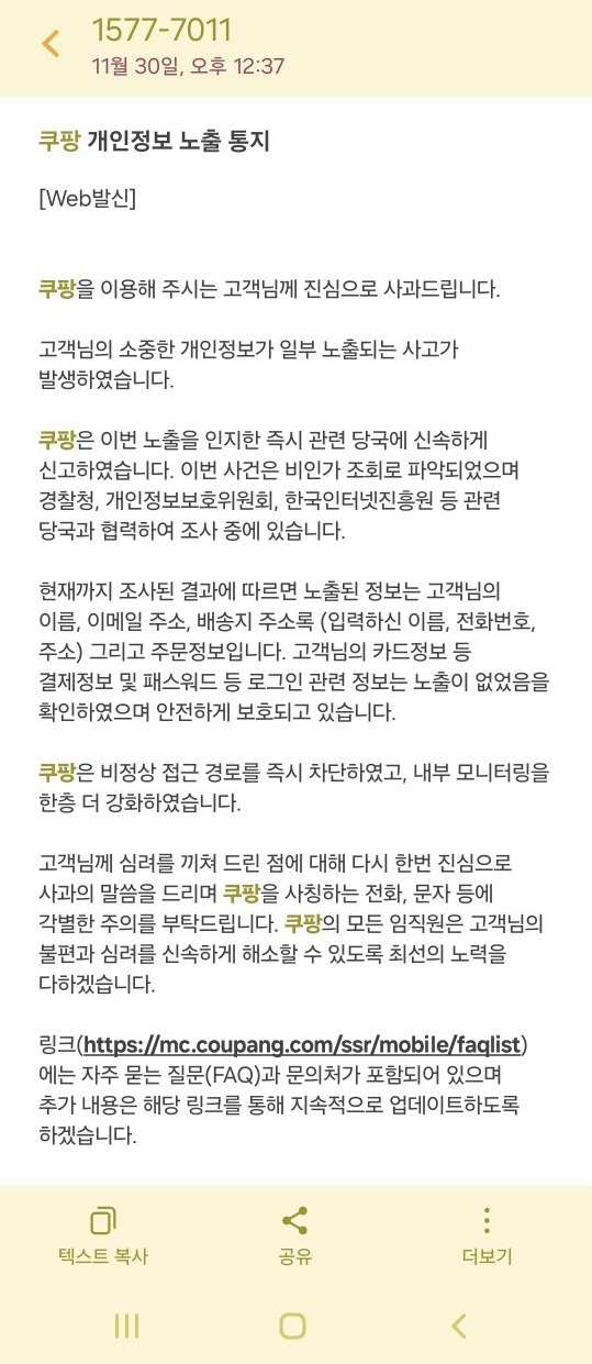 또한 최근 주문·환불·결제 내역을 수시로 확인해 본인이 하지 않은 활동이 있는지 점검해야 하며, ‘쿠팡 배송 오류’나 ‘환불 안내’를 사칭한 문자 링크는 열지 않는 것이 안전하다. 배송지에 공동현관 비밀번호가 저장돼 있었던 이용자는 해당 비밀번호도 함께 변경할 것이 권고된다.
