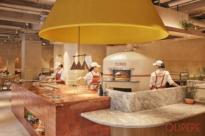 올리페페 매장은 광화문 청계한국빌딩 2층에 약 170평, 156석 규모로 조성됐다. 매장 내부는 이탈리아 거리 풍경에서 영감을 얻어 현지 건축 요소를 모던하게 재해석해 따뜻하고 경쾌한 분위기를 구현했다. 매장 중앙의 피자 화덕과 오픈형 주방에서는 나폴리 피자협회의 인증을 받은 '카푸토 밀가루'로 매일 직접 도우를 만들고, 풍성한 토핑을 얹어 구워내는 과정을 시각적으로 생동감 있게 전달한다. 청계천이 내려다 보이는 창가 좌석부터 부스석, 바 좌석, 단체룸까지 다양한 좌석을 마련해 방문 목적에 맞는 편안한 이용이 가능하다.