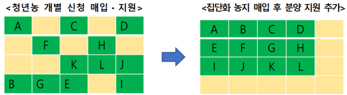 또한 사업 물량이 적어 매년 특정 기간을 정해 공모로 추진하던 선임대후매도 사업 방식을 연중 신청․지원으로 변경하고, 청년들이 모여 창업 타운을 만들 수 있도록 대규모(5~10ha)의 우량 농지를 매입 후 임대 분양하는 방식을 새롭게 도입한다.