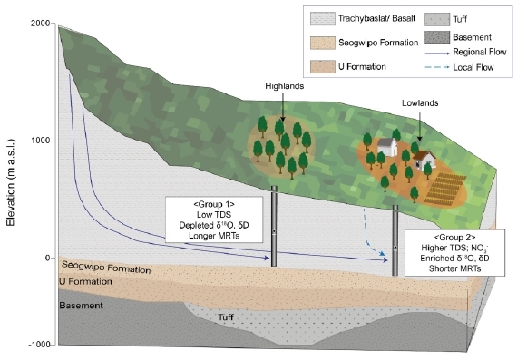 다중 환경추적자 자료를 상호 검증해 연령모델에 적용한 결과, 제주삼다수의 근원이 되는 빗물은 한라산 국립공원 내 해발 1,450m 이상 고지대에서 함양되는 것으로 확인됐으며, 지하수의 평균 체류시간은 약 31년으로 산정됐다.