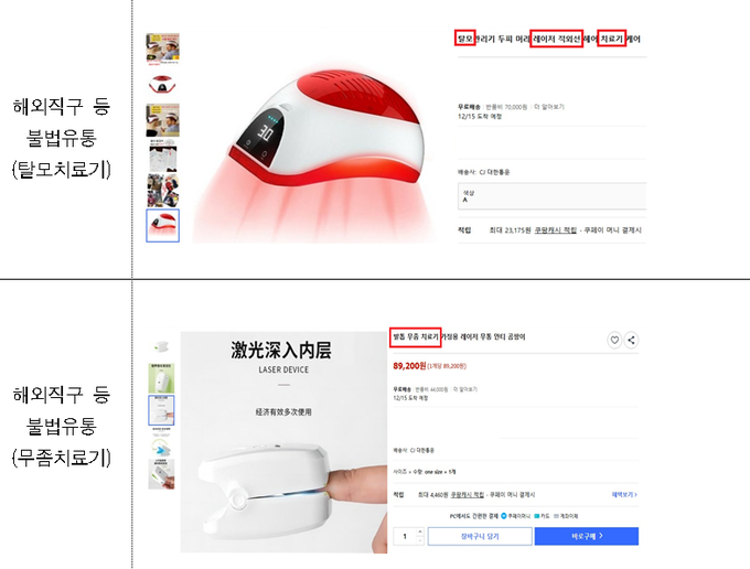 22일 식약처에 따르면 이번 점검은 탈모레이저·무좀레이저 등 의료기기 불법 해외직구 광고, 화장품의 의학적 효능 과장, 의약외품의 치료 효과 허위 표방 등을 중심으로 이뤄졌다. 특히 해외직구를 통한 무허가 의료기기 유통과 ‘탈모약·발모제’ 등 소비자를 오인시킬 수 있는 표현이 집중 단속 대상이 됐다.