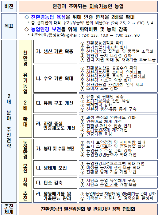 구체적으로 친환경인증농가 수익성 개선과 경영안정 지원을 통해 친환경 농업 생산기반을 확충할 계획으로 실태조사, 의견수렴 등 친환경농업직불 적정 단가 검토를 통해 친환경농업의 수익성을 개선하고, 필지별 지급횟수 제한기준을 완화하여 신규 농가의 친환경농업 전환을 독려할 계획이다.