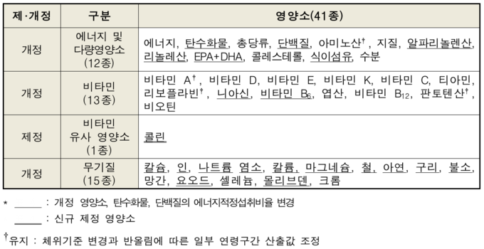 이와 함께 식이섬유, 비타민 B6, 칼슘, 인, 나트륨 등 총 20개 영양소의 적정 섭취기준이 조정됐다.