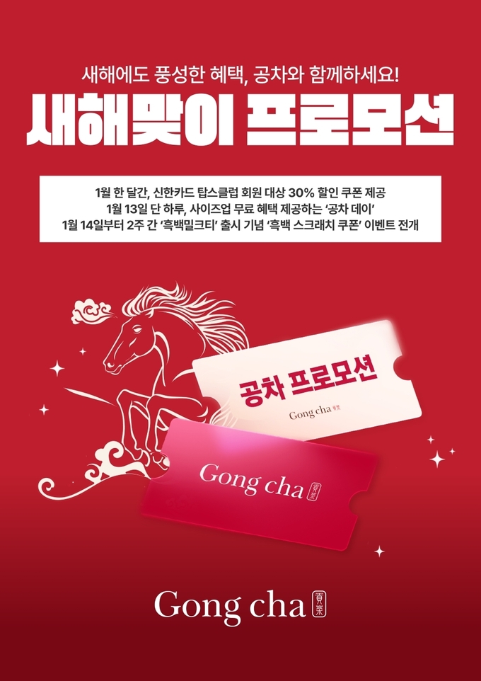이번 프로모션은 새해를 맞아 고객들이 공차의 베스트셀러와 신메뉴를 보다 실속 있게 즐길 수 있도록 기획됐다. 공차코리아는 1월 한 달간 ‘신한카드 탑스쿠폰’ 프로모션을 비롯해 자사 단독으로 마련된 ‘공차 데이’, ‘흑백 스크래치 쿠폰’ 이벤트 등을 순차적으로 선보인다.