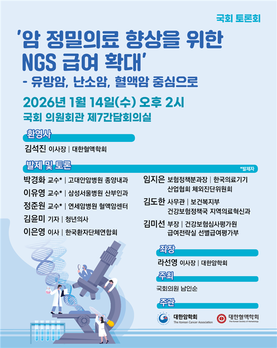 발제는 박경화 고려대학교 안암병원 종양내과 교수(유방암), 이유영 삼성서울병원 산부인과 교수(난소암), 정준원 세브란스병원 혈액내과 교수(혈액암)가 「암 정밀의료 확대를 위한 NGS 급여 확대 과제」를 주제로, 각 암종별 임상 현황과 제도적 쟁점을 중심으로 의견을 제시할 예정이다.