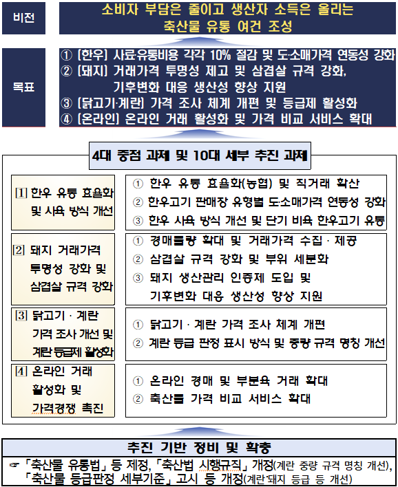 그동안 도축–가공–판매 일원화, 도축장 구조조정, 시설 현대화 등으로 유통 기반은 선진국 수준으로 개선됐지만, 일부 비효율적인 거래 관행과 사육 방식으로 산지가격 하락이 소비자가격에 충분히 반영되지 않는다는 지적이 지속돼 왔다.
