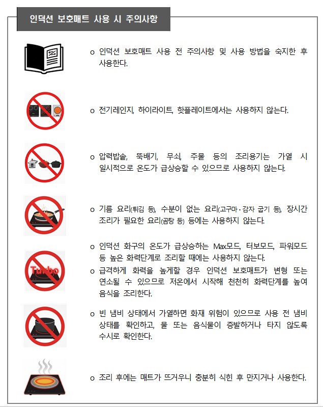 한국소비자원은 인덕션 보호매트 사용 시 ▲튀김 등 기름 요리에 사용하지 말 것 ▲빈 냄비 상태에서 가열하지 말 것 ▲조리 중 수분 증발 여부를 수시로 확인할 것 ▲사용 후 충분히 식힌 뒤 만질 것 등을 강조했다.