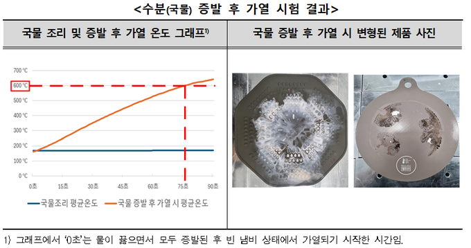 특히 사용자의 부주의로 국물이 모두 증발한 상태에서 가열이 지속될 경우, 30초 이내 300℃를 넘고 평균 77초 만에 600℃ 이상으로 치솟았다. 약 400℃ 이상에서는 보호매트 표면이 눌어붙거나 그을리며 연기와 불꽃이 발생해 실제 화재로 이어질 가능성이 확인됐다.