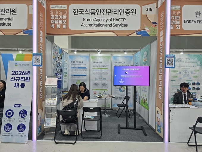 [푸드투데이 = 황인선기자] 한국식품안전관리인증원(원장 한상배, 해썹인증원)은 지난 27일부터 29일까지 에이티(aT)센터(서울 양재)에서 열린 ‘2026 공공기관 채용정보 박람회’에 참여해 채용 상담관(제2전시장)을 운영했다.