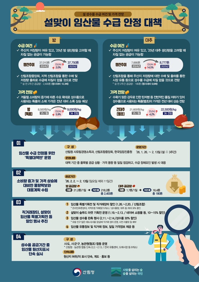 대책반은 물가안정과 수급 조절을 위해 임산물의 가격 동향 및 공급 상황을 매일 점검하고, 성수품 수요가 늘어나는 설 2주 전부터 밤과 대추를 평상시보다 10배 늘린 2,580톤을 공급해 성수품의 시장가격 안정을 유도할 계획이다.