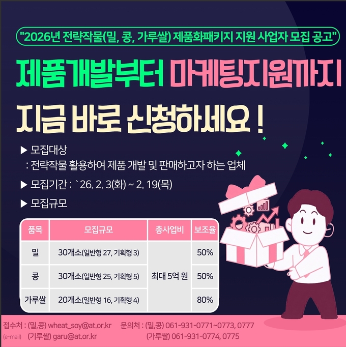 지원 내용으로는 제품개발, 포장, 시제품 생산, 홍보·판촉, 수출 등 전 단계에 걸쳐 진행되며, 단일 업체가 신청하는 일반형은 최대 3억 원, 유통업체 컨소시엄 등 기획형은 최대 5억 원까지 지원되고, 국비 지원율은 품목별로 밀과 콩은 50%, 가루쌀은 80%이며, 신청은 오는 19일까지 밀과 콩 분야는 wheat_soy@at.or.kr, 가루쌀 분야도 garu@at.or.kr로 접수하며 된다.
