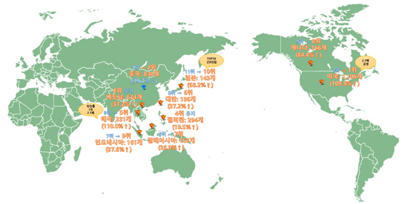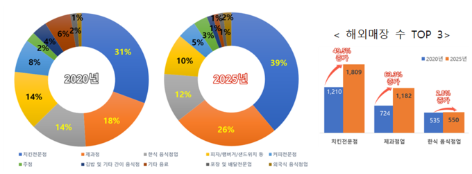 업종별로는 치킨전문점, 제과점업, 한식 음식점업 순으로 해외 진출 비중이 높았다. 이 가운데 치킨전문점이 1,809개 매장, 제과점업이 1,182개 매장으로 전체 해외 매장의 약 64%를 차지했다. 한식 음식점업은 550개 매장으로 매장 수는 증가했으나, 전체 비중은 소폭 감소했다.