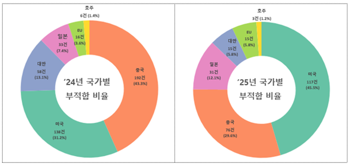 그러나 분기별 흐름을 살펴보면 경계심을 늦출 수 없는 상황이다. 2025년 4분기 부적합 사례는 총 100건으로, 직전 분기(61건) 대비 63.9%나 증가했다. 이러한 증가세는 미국과 중국 시장에서 두드러졌다.