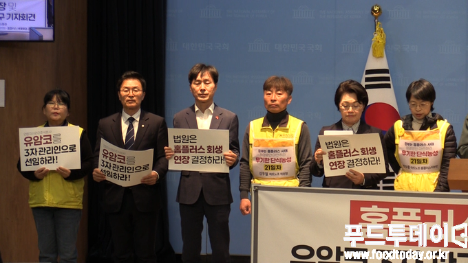[푸드투데이 = 노태영기자] 23일 더불어민주당 을지로위원회(위원장 민병덕), 진보당, 사회민주당과 마트노조 홈플러스지부는 국회에서 홈플러스 회생 연장 및 유암코 3차 관리인 선임 촉구 기자회견을 개최했다.