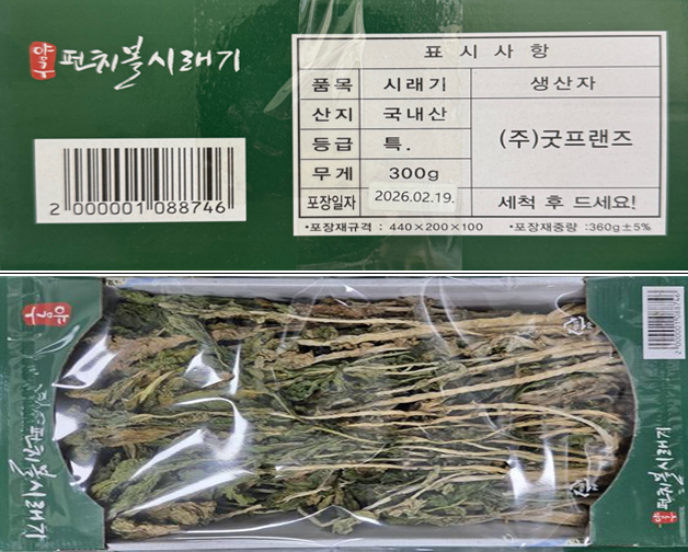 회수 대상은 굿프랜즈(서울 송파구 소재)가 포장·판매한 ‘시래기’ 제품으로, 포장일이 2026년 2월 19일, 내용량 300g 제품이다. 해당 제품은 강원 양구군에서 소분·포장 작업이 이뤄졌으며, 총 생산량은 3,000kg이다.