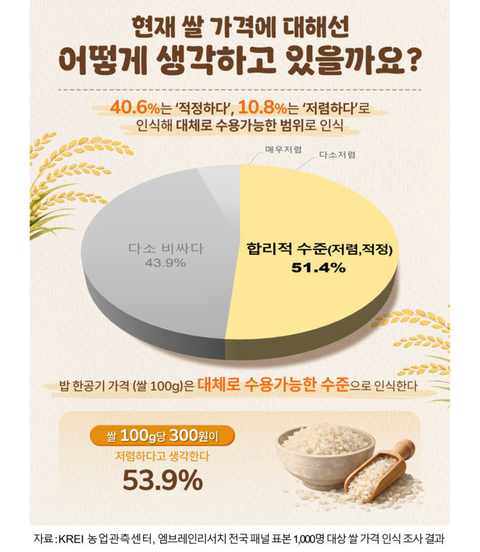 지난해 11월 한국농촌경제연구원(KREI)‘쌀 소비자 인식조사’결과에 따르면 응답자의 40.6%가 현재 쌀값에 대해‘적정하다’고 답했으며, ‘저렴하다’는 응답도 10.8%에 달했다.