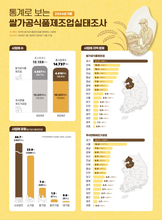 조사 결과에 따르면, 2024년 말 기준 국내 쌀가공식품 제조업 사업체 수는 14,737개소이며, 종사자 수는 86,890명으로 집계됐다. 전년 대비 사업체와 종사자 규모는 다소 감소했으나, 쌀가공식품 부문 총 판매액은 8.4조 원을 기록하며 전년(8.2조 원) 대비 성장세를 이어갔다.