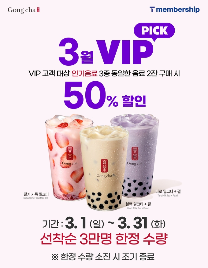 31일까지 진행되는 SKT VIP PICK 프로모션은 공차 베스트 메뉴 3종 가운데 동일 음료 2잔 구매 시 50% 반값 혜택을 제공하며, 이용 방법은 T 멤버십 앱 VIP PICK 메뉴에서 공차를 선택한 후 매직 바코드를 제시하면 되고, 블랙 밀크티 + 펄, 타로 밀크티 + 펄, 딸기 가득 밀크티 등으로 구성됐다.