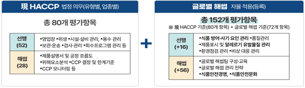 글로벌 해썹(Global HACCP)은 기존 해썹을 기반으로 식품방어(Food Defense), 식품사기 예방(Food Fraud Prevention), 알레르기 유발물질 관리, 식품안전문화, 식품안전경영 요소 등을 포함한 확장형 식품안전관리 체계다. 국제식품규격위원회(CODEX) 지침과 미국 식품안전현대화법(FSMA)의 핵심 개념 등을 반영해 설계됐으며, 기존 해썹의 80개 평가항목에 72개의 관리 항목을 추가한 총 152개 평가항목으로 보다 촘촘한 관리 기준을 제시한다.