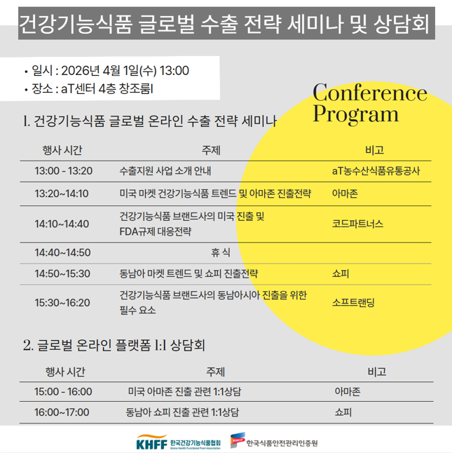 오후 1시부터 aT센터 4층 창조룸Ⅰ에서 진행되는 ‘건강기능식품 글로벌 온라인 수출 전략 세미나’는 회원사 수출 담당자 약 140명이 참석할 예정이다. 세미나는 △aT 수출 지원 사업 소개를 시작으로 △미국 시장 건강기능식품 트렌드 및 아마존 진출 전략 △건강기능식품 브랜드사의 미국 진출 사례와 FDA 규제 대응 전략 △동남아 시장 트렌드 및 쇼피 진출 전략 △건강기능식품 브랜드사의 동남아 시장 진출을 위한 핵심 고려 사항 등을 주제로 진행된다.