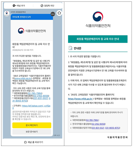 [푸드투데이 = 황인선기자] 식품의약품안전처(처장 오유경)는 카카오와 협업해 화장품 영업자를 대상으로 책임판매관리자 법정 교육 등 법적 의무 사항을 8일부터 모바일 전자문서 서비스를 통해 제공한다고 밝혔다.