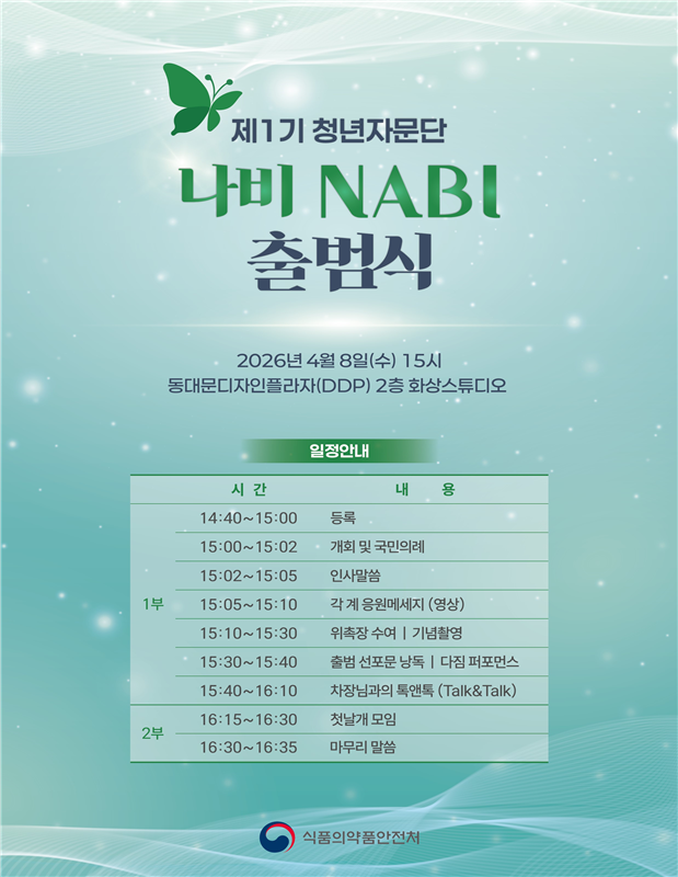 [푸드투데이 = 황인선기자] 식품의약품안전처(처장 오유경, 이하 식약처)는 청년층이 식품 정책 논의 과정에 직접 참여하는 제1기 청년자문단 ‘나비(NABI)’ 단원을 위촉하는 출범식을 8일 개최했다.