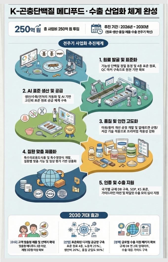 농촌진흥청(청장 이승돈)은 9일 국립농업과학원에서 ‘K-곤충산업 미래 비전 공유회’를 열고, 식용곤충을 특수의료용도식품(메디푸드) 소재로 고도화해 2030년까지 글로벌 수출 산업으로 육성한다는 전략을 발표했다.