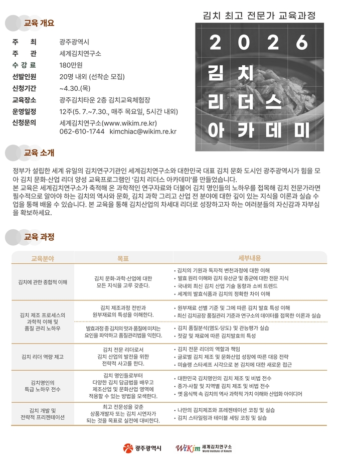[푸드투데이 = 노태영기자] 세계김치연구소(소장 장해춘, 이하 연구소)와 광주광역시(시장 강기정)가 김치산업의 지속적인 성장 기반을 마련하기 위해 2026년 김치 리더스 아카데미를 개설하고, 오는 30일까지 수강생을 모집한다.