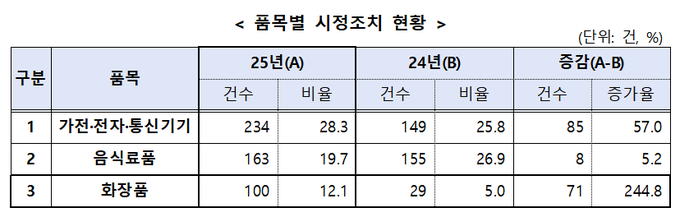 음식료품은 총 163건이 적발돼 가전 제품에 이어 두 번째로 높은 비중(19.7%)을 차지했다.