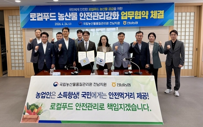 [푸드투데이 = 노태영기자] 국립농산물품질관리원 전남지원(지원장 박은엽, 이하 농관원 전남지원)은 농협전남본부(본부장 이광일)와 24일 전남 무안군 농협전남본부에서 로컬푸드 농산물 안전관리 업무협약을 체결했다고 밝혔다.