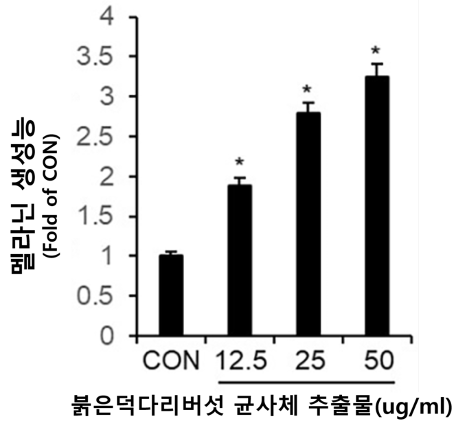이번 연구 결과, 붉은덕다리버섯 균사체 추출물은 멜라닌의 세포 외, 세포 내 생성량을 모두 유의적으로 증가시키는 것으로 나타났고, 멜라닌 합성의 핵심 효소인 타이로시나아제(tyrosinase)의 발현과 활성을 증가시키고, 이를 조절하는 전사인자의 발현도 촉진하는 것으로 확인됐다고 산림과학원은 설명했다.