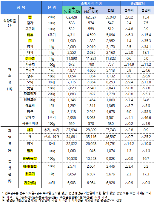28일 농림축산식품부(장관 송미령)에 따르면 4월 5주차 수급동향 점검 결과, 농산물 가격은 지난주와 비교해 큰 변동 없이 전년 대비 낮은 수준을 유지하고 있는 것으로 분석됐다.