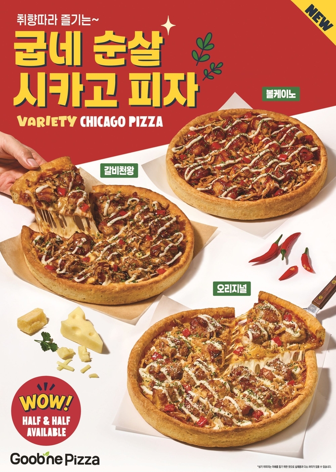 라인업으로 기본에 충실한 오리지널, 단짠단짠 풍미의 갈비천왕, 매콤달콤한 볼케이노 등 익숙한 치킨 메뉴들의 정체성을 피자로 재해석했으며, 한 판으로 두 가지 맛을 동시에 즐길 수 있는 하프앤하프(Half & Half) 옵션도 제공한다.